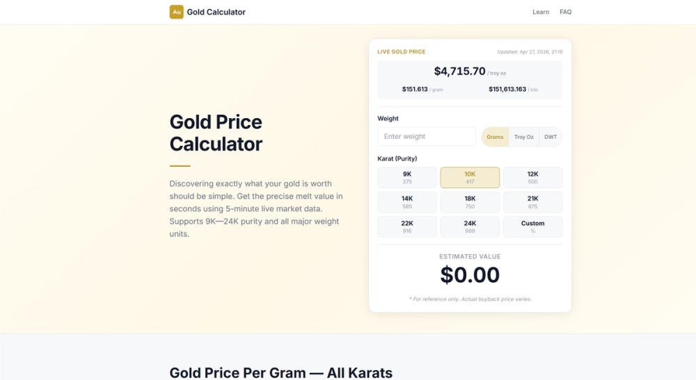 The Gold Price Calculator is a specialized financial tool designed to provide users with the precise melt value of gold items based on 5-minute live market data. It supports a wide range of purity levels from 9K to 24K and handles multiple weight units including grams, troy ounces, and pennyweights (DWT).
